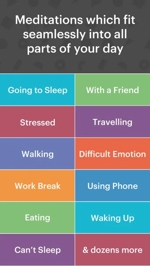 No need to find the time for a formal meditation session everyday, we'll show you how to bring mindfulness to all parts of your life with exercises for whatever you're doing and wherever you are - from travelling, taking a break at work or going to sleep. We'll help you find calm in any situation.