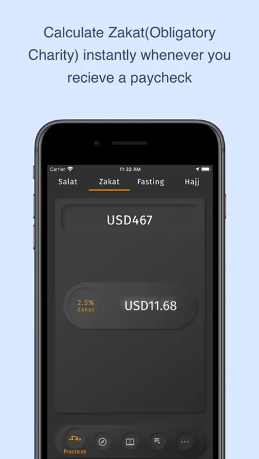 Just enter the amount of money you have earned and it will automatically calculate the amount of Obligatory Charity (Zakat) due on it (2.5%).