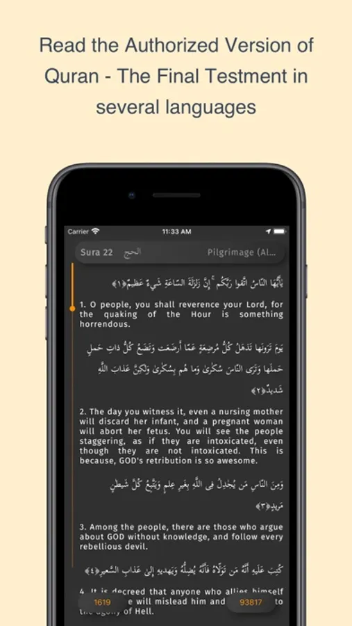 One of the first apps in the world which includes Arabic Version of the Quran with Authorized English Version by Dr. Rashad Khalifa and includes glossary, Index and Appendices for definition of Quranic terms and detailed explanation of vital subjects from the Quran.