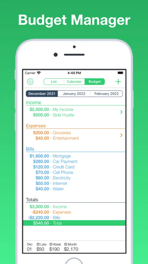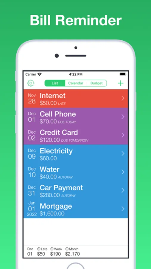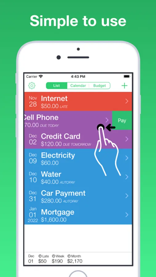 A simple app to help you keep track of your bills so you can pay them on time. View a list or calendar of your upcoming bills, late bills and paid bills. Be reminded before your bills are due. Have your bills reoccur automatically, so you're always up to date on what's due. Have bills that are setup for autopay? Jitto can remember this. Quickly see the cost of upcoming bills, so you know how much is due in the upcoming weeks. Add income and expenses to make managing a simple budget easy.