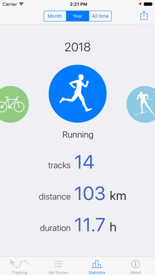 View total distance, duration and route count for each of your activity. For last month, last year or All time.