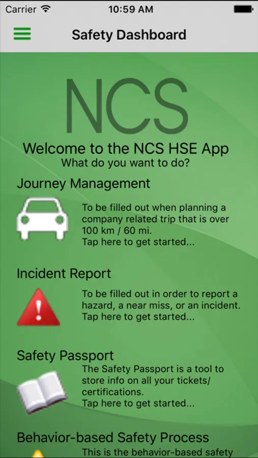 The NCS Health & Safety (HSE) app is an utility application for employees, contractors & customers in the oil and gas industry to submit Incident Reports, Trip Assessments, keep their Safety Passports to store their training certifications, onsite inspection forms and much more.