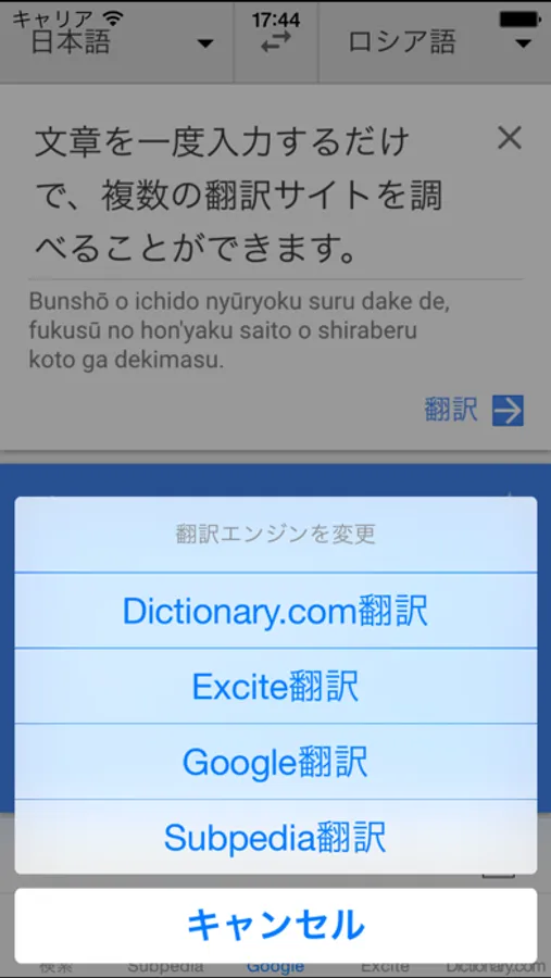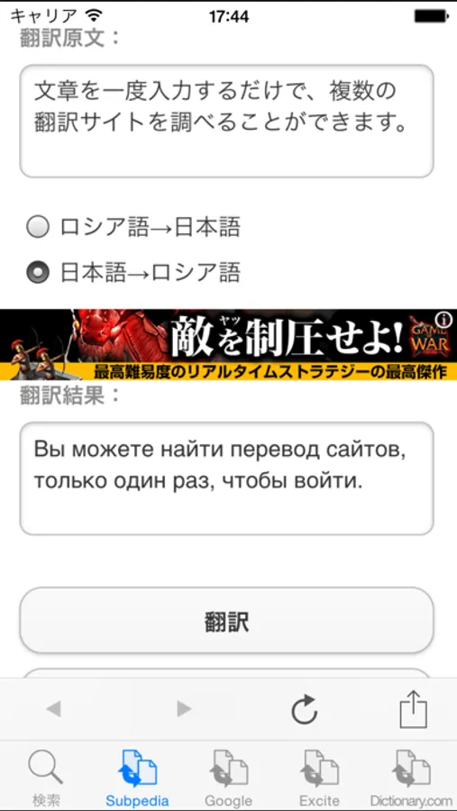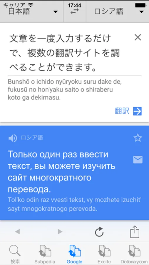 With “Japanese-Russian Translator”, just by entering your text once, you can search multiple translation websites. For example, even when Google’s translation results don’t make sense, you can switch between tabs to see the results from Excite’s translator as well as Dictionary.com’s translator.