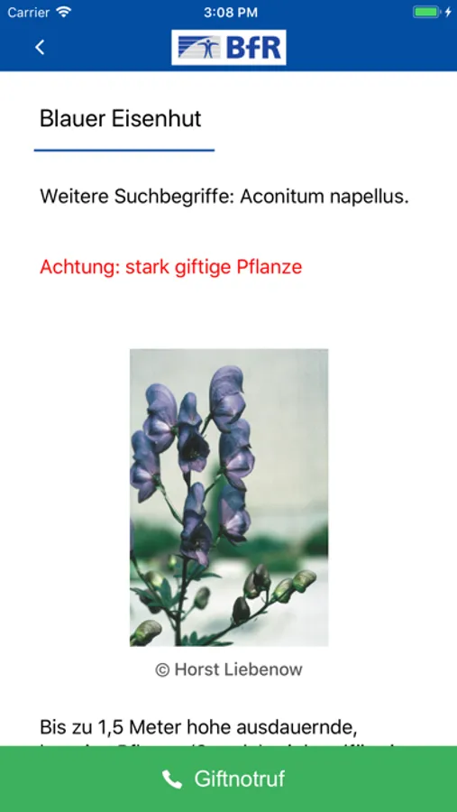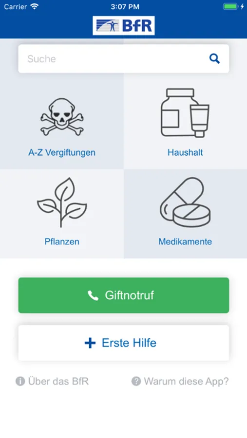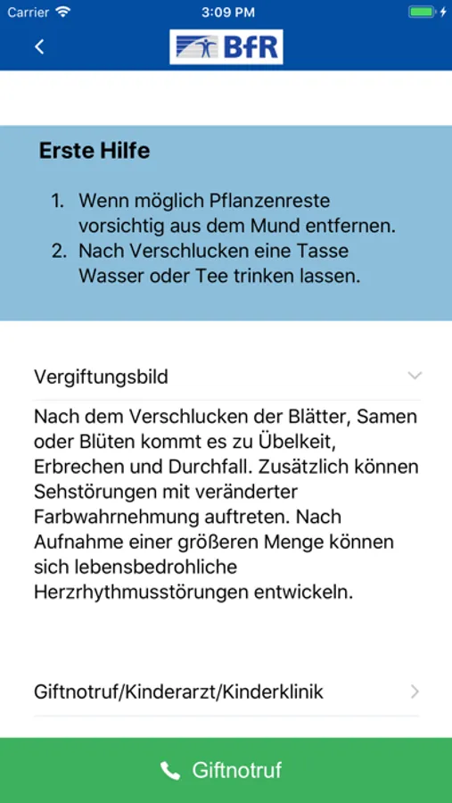 App informiert über Vergiftungsrisiken, Erste-Hilfe-Maßnahmen und verbindet schnell mit dem zuständigen Giftnotrufzentrum.