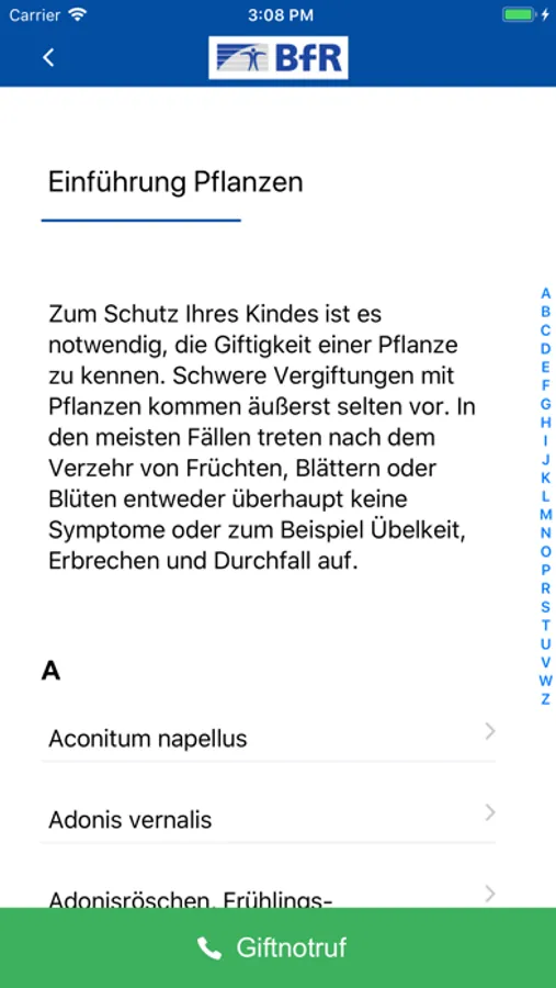 1. Unter „A-Z Vergiftung“ finden Sie alle Produkte, die in dieser App erwähnt werden, alphabetisch sortiert.
