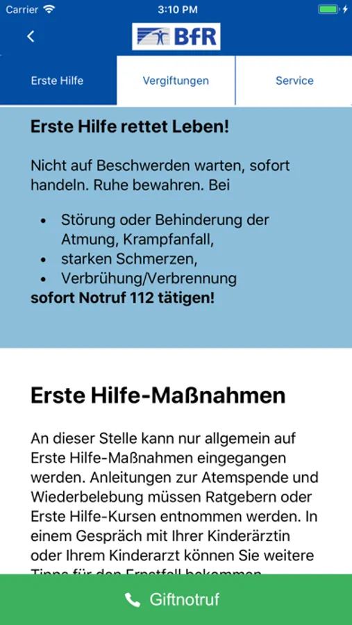 Im Bereich „Erste Hilfe“ erhalten Sie neben Tipps für allgemeine Erste-Hilfe-Maßnahmen im Vergiftungsfall auch Erste-Hilfe-Maßnahmen für verschiedene Unfall- und Vergiftungsszenarien.