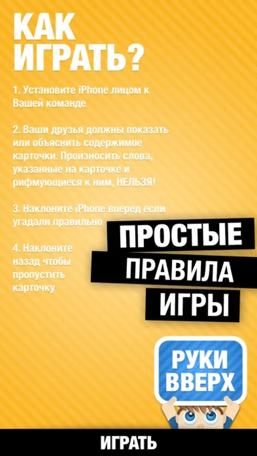 Правила максимально просты. Ваша команда должна показать, рассказать, спеть или просто объяснить содержимое карточки. Вы, тем временем, должны как можно быстрее угадать карточку. Наклоните iPhone/iPad вперед если угадали правильно, наклоните назад чтобы пропустить карточку. На все дается 60 секунд.