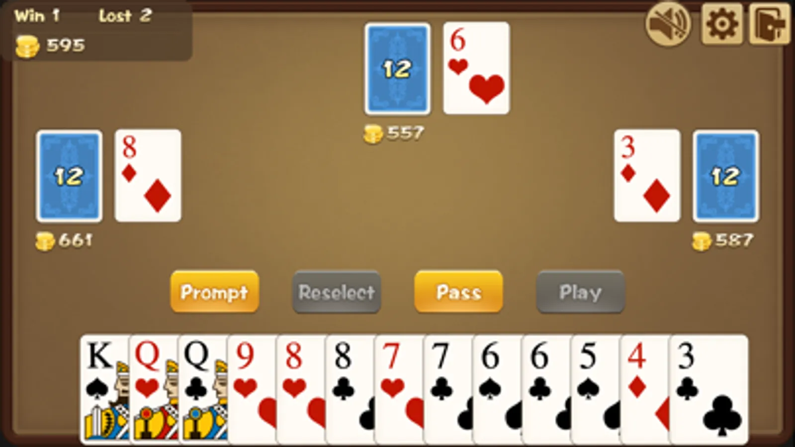 Big 2 is a popular poker game, with rules easy to learn. It is very dynamic and exciting intense. Each player plays for himself, but it need to cooperate with each other as much as possible to achieve the greatest benefit. The relationship between the enemy an ourselves is rapidly changing.