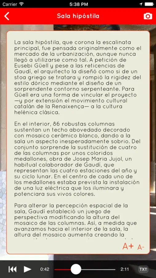 Esta aplicación propone un itinerario ideal de descubrimiento del Park Güell mediante una cuidada selección de 20 puntos de interés en los que un narrador desvela los aspectos más relevantes para la comprensión de una de las más populares obras de Antoni Gaudí.