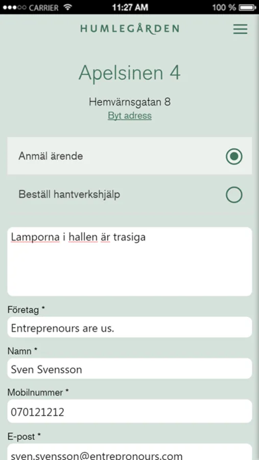 Med hjälp av denna app kan du som hyresgäst hos Humlegården Fastigheter rapportera ärenden och beställa snickarhjälp snabbt och smidigt direkt i din iPhone eller iPad. Varje rapporterat ärende loggas och vi håller dig underrättad om utvecklingen i ärendet.