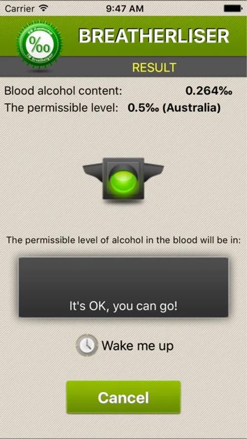 The app "Breathalyzer" has a prank alarm clock that will wake you up after a certain period, which corresponds to the supposed time required to achieve the acceptable limit for blood alcohol concentration.