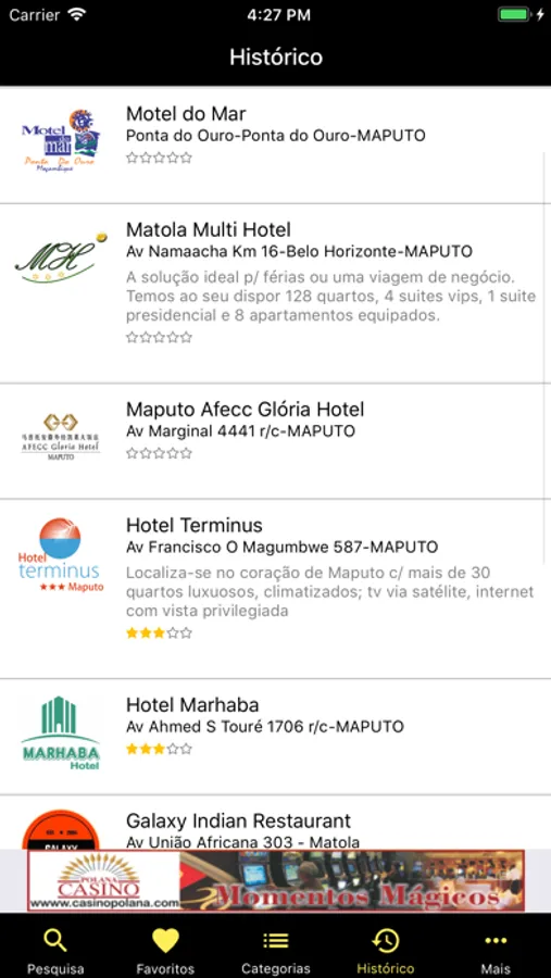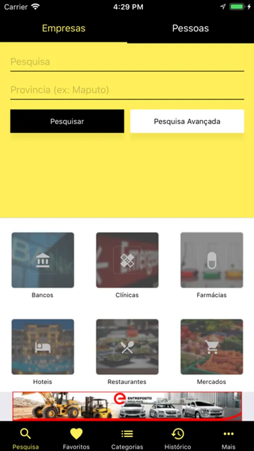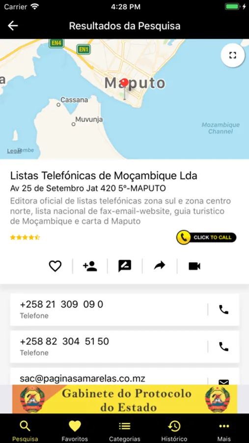 A Aplicação de Páginas Amarelas, permite pesquisar pelo nome, telefone, fax, telemóvel, actividade, localidade e/ou palavra-chave, contactos de empresas e de residenciais em Moçambique, de forma facil, pratica e rápida.