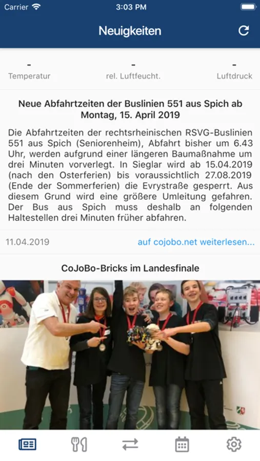 Die CoJoBo App bietet Schülern des Collegium Josephinum Bonn die Möglichkeit ganz einfach auf Vertretungsplan, Schultermine, Speiseplan, Messplan und ihre Einstellungen zuzugreifen. Zudem können aktuelle Neuigkeiten mitverfolgt werden.