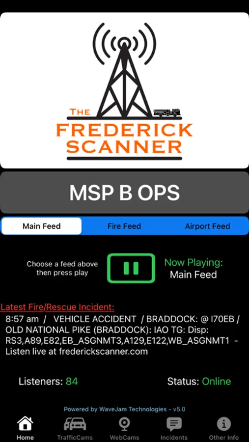 The Frederick Scanner Pro is a live audio stream of Frederick, Maryland Police, Fire, Rescue, and Highway communications. Just start the app, press the play button and you're tapped into the Frederick scene. Choose "Fire Feed" and you'll hear only Fire, Rescue, EMS communications. Choose the "Airport Feed" to listen in on the local FDK Airport communications. All the other Fire/Police feed apps use services like Broadcastify and are delayed 1-2 minutes but the FredScanner Pro audio is delayed by on a few seconds!