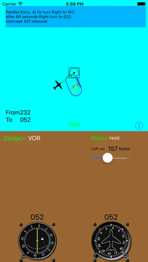 NavTutor provides a visual representation of an aircraft and a holding pattern relative to a navigation aid. This allows you to learn how to determine your position based on the ADF, VOR and Heading Information in the aircraft as well as determine the correct entry pattern for standard and non-standard holds