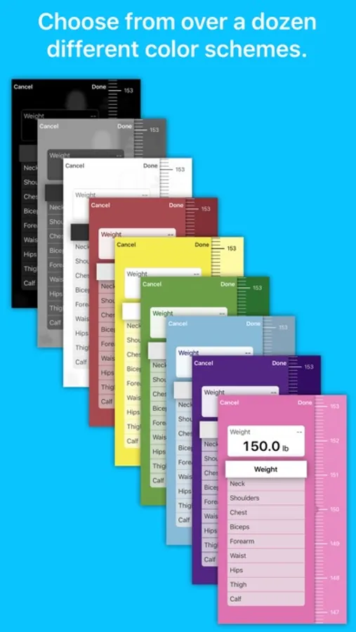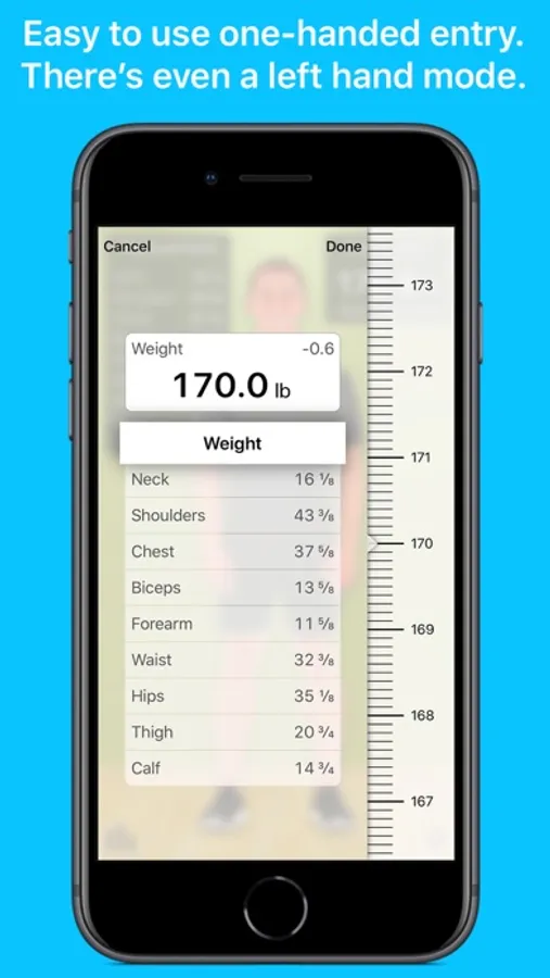 • Keep track of your weight plus 10 other body measurements, such as waist, hips, and biceps.