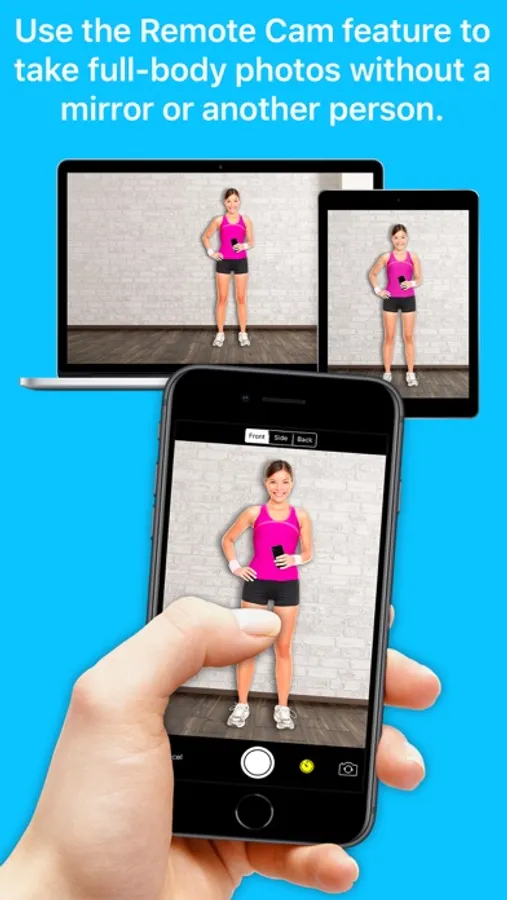 My Body Metrics has a unique approach to taking photos. You can use the traditional approaches of taking the photos yourself using a mirror or have someone else take them for you, or you can use the Remote Cam feature. This lets you connect to another iPhone, iPad, or Mac over WiFi and use its camera to take full-body photos without the need for a mirror or another person.