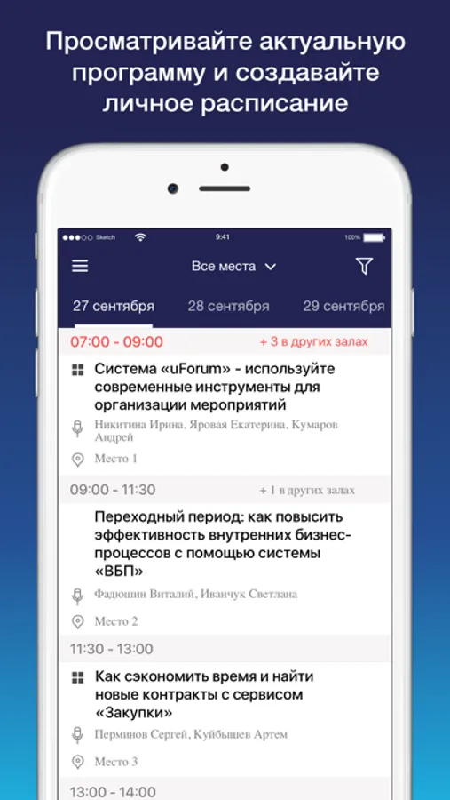 - узнать подробности о каждом событии, включая докладчиков и место проведения;