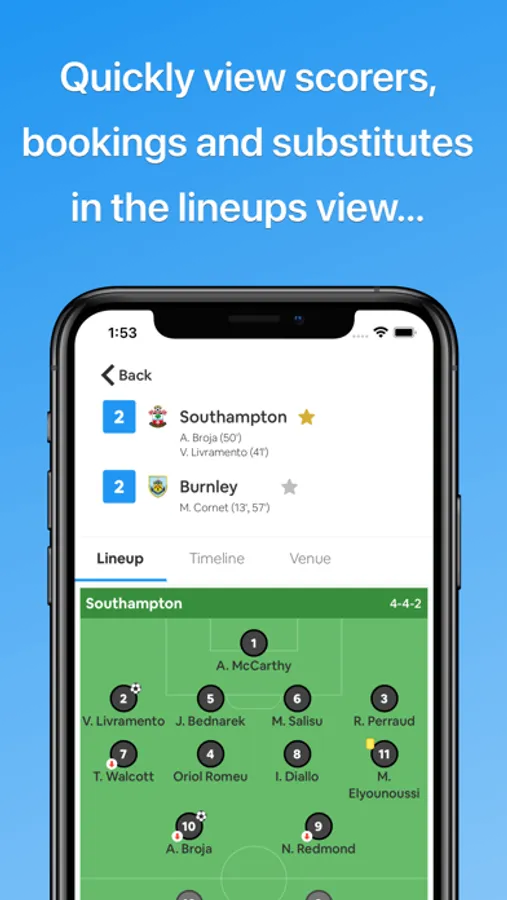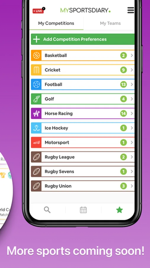 Create your own personalised sports diary and view fixtures and events for your sporting interests and your favourite teams….all in a handy format with instant access to results, league tables, form, team line-ups and formations and in-match timeline displaying goals, scorers, assists, cards, substitutions, VAR incidents and more as they happen in real time!
