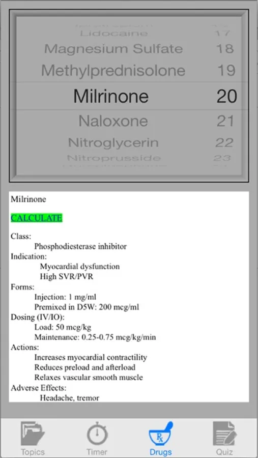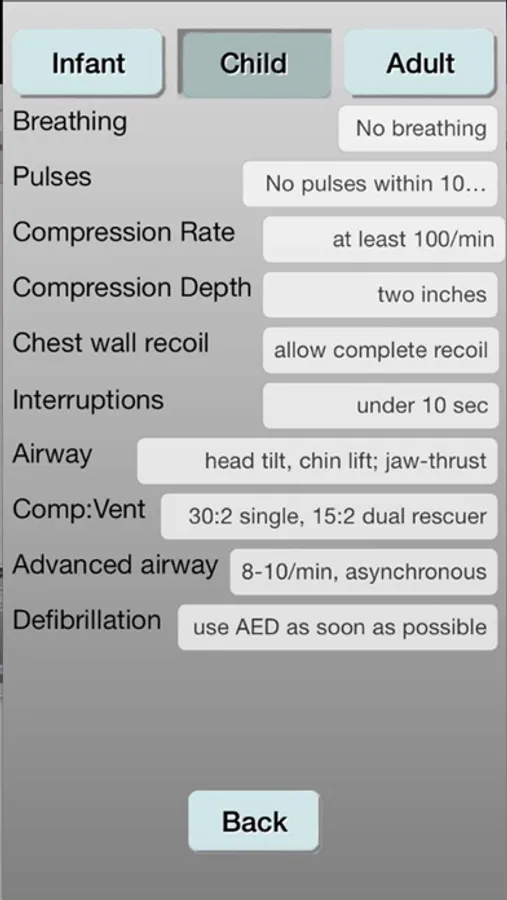 The tab controller gives one access to the major topics covered in the PALS manual. These topics include the PALS systemic approach to the seriously ill child, age-appropriate vitals, the pediatric arrest algorithm, CPR summary, shock management and diagnosis, a Glascow calculator, the bradycardia and tachycardia algorithm, and the post-resuscitation algorithm. A comprehensive drug calculator has all the drugs listed in the PALS manual. Select the drug and patient weight and you get the correct dosing. There is also a code timer that alarms every two minutes to remind you to recheck vitals or give medications.