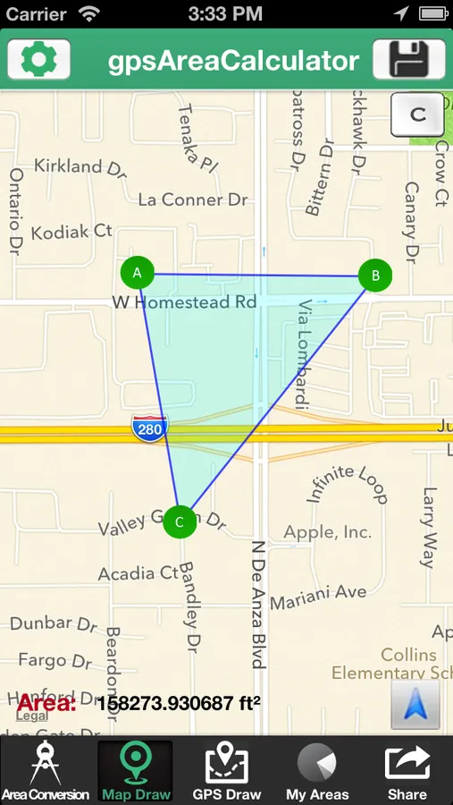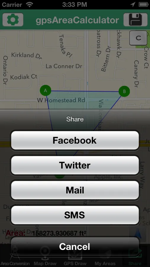 - Share the saved area with friends on Social Media Apps like Facebook, Tweeter or you can even share with Email or SMS.