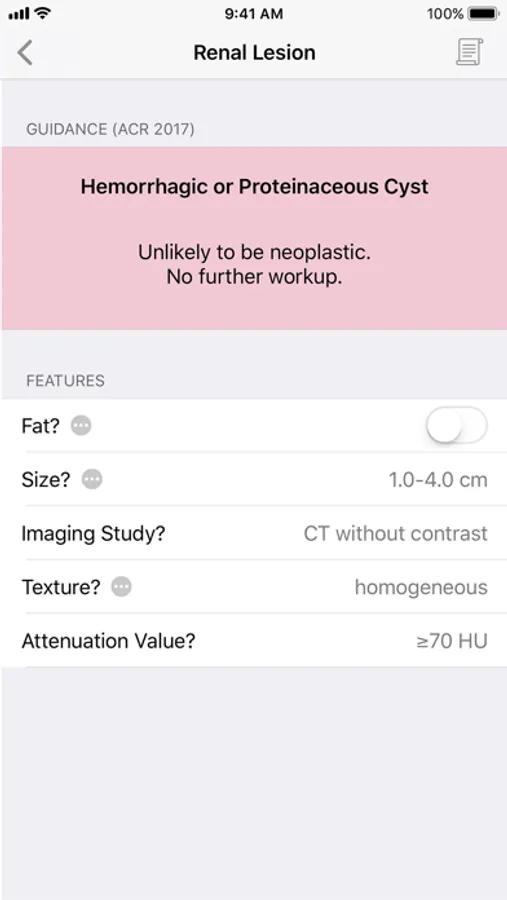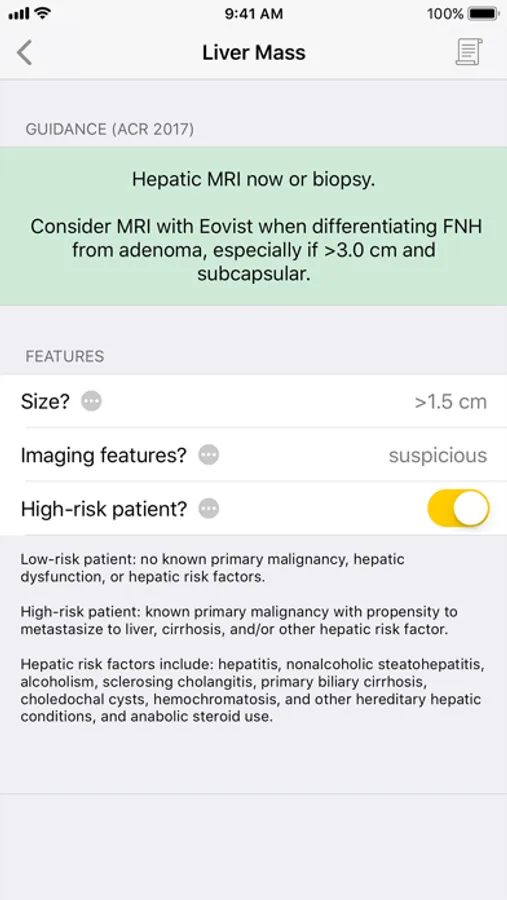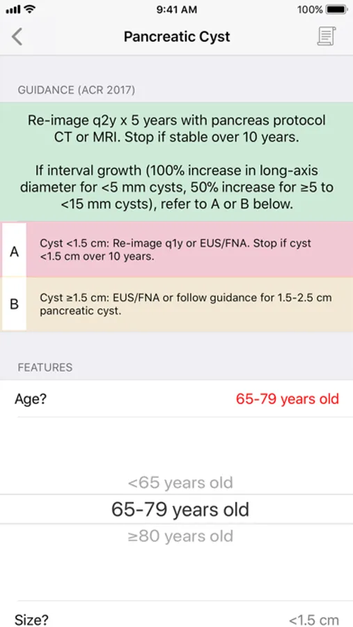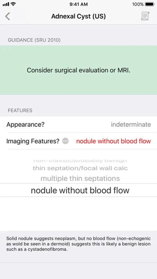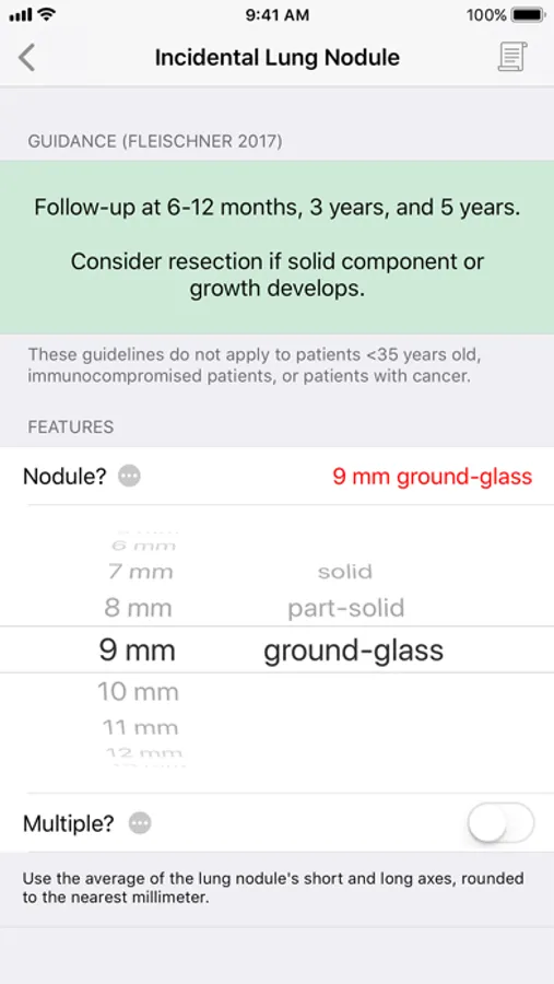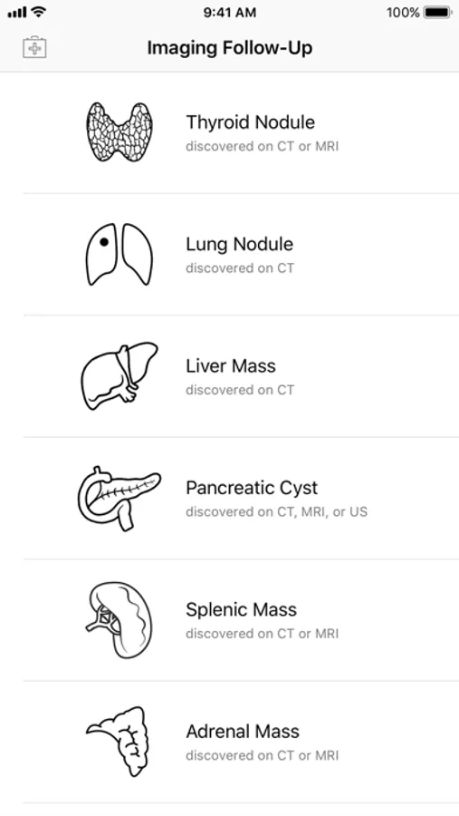 This app guides you through an effortless adaptation of the most current guidelines of the American College of Radiology's Incidental Findings Committee, Fleischner Society, and Society of Radiologists in Ultrasound.