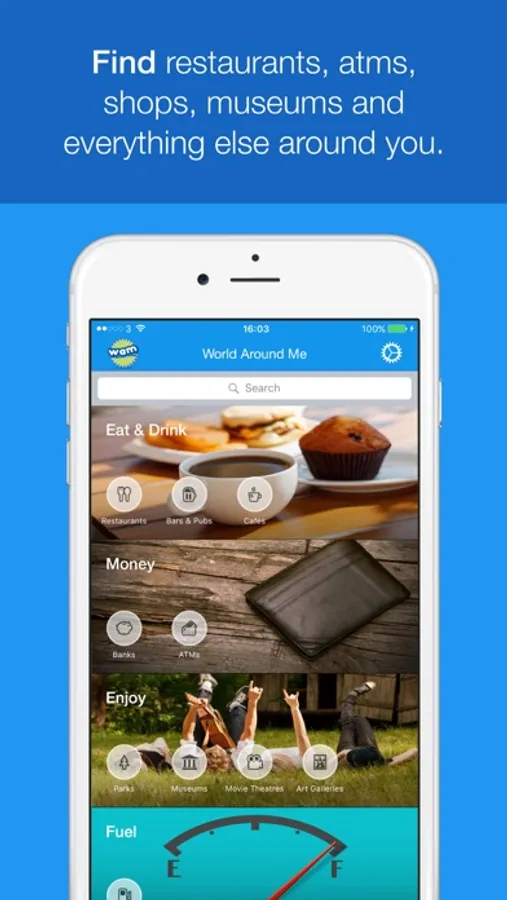 World Around Me is a unique way to find useful places around you - such as restaurants, ATMs, pharmacies, groceries, doctors, shops, bus/metro stations and more. WAM uses your phone’s camera to give you a completely new way of exploring a place, anywhere in the world.