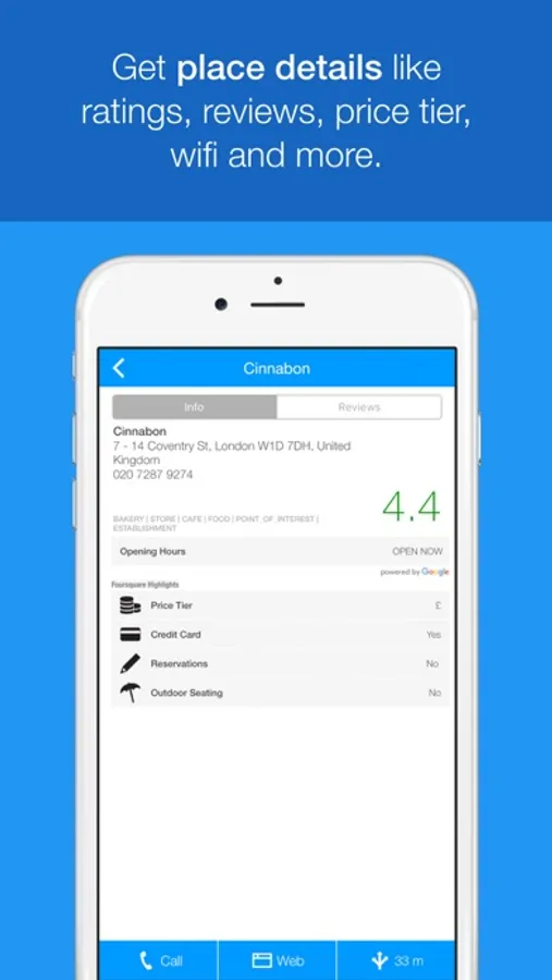 ◆ Get useful info such as: WiFi availability, accepts credit cards, takes reservations, has outdoor seating.