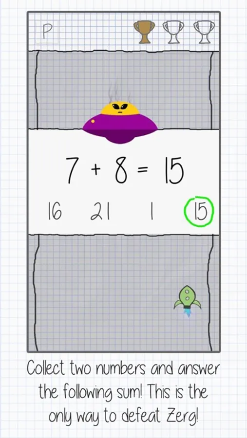 Here's how it works: Hold your device with both hands and tap the screen to move the rocket. Dodge the falling meteors and collect the numbers. When you've collected two numbers, answer the following sum. Correct answers will weaken Zerg and bring math back to the planet. Incorrect answers can be found in the revision section for further study.