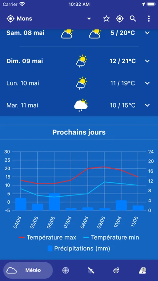 Consultez nos prévisions météo avec les températures minimales, maximales, risque de précipitations, nébulosité, vitesse et direction du vent