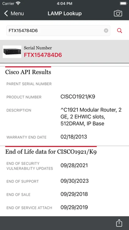 LAMP (SM) gives you ability to gather end of life and migration information about your Cisco equipment through our LAMP LOOKUP (TM) for Cisco products tool. With just a serial number — typed or scanned via barcode with your camera — the LAMP app will gather and present data from multiple sources. This version of LAMP is available to all users, whether LaSalle Solutions customer or not.