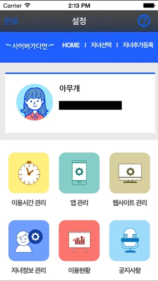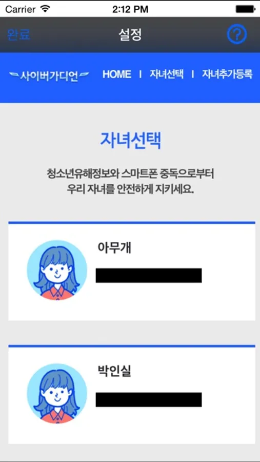 ‘사이버가디언’은 ‘자녀용’과 ‘부모용’이 하나로 구성되어 있습니다.