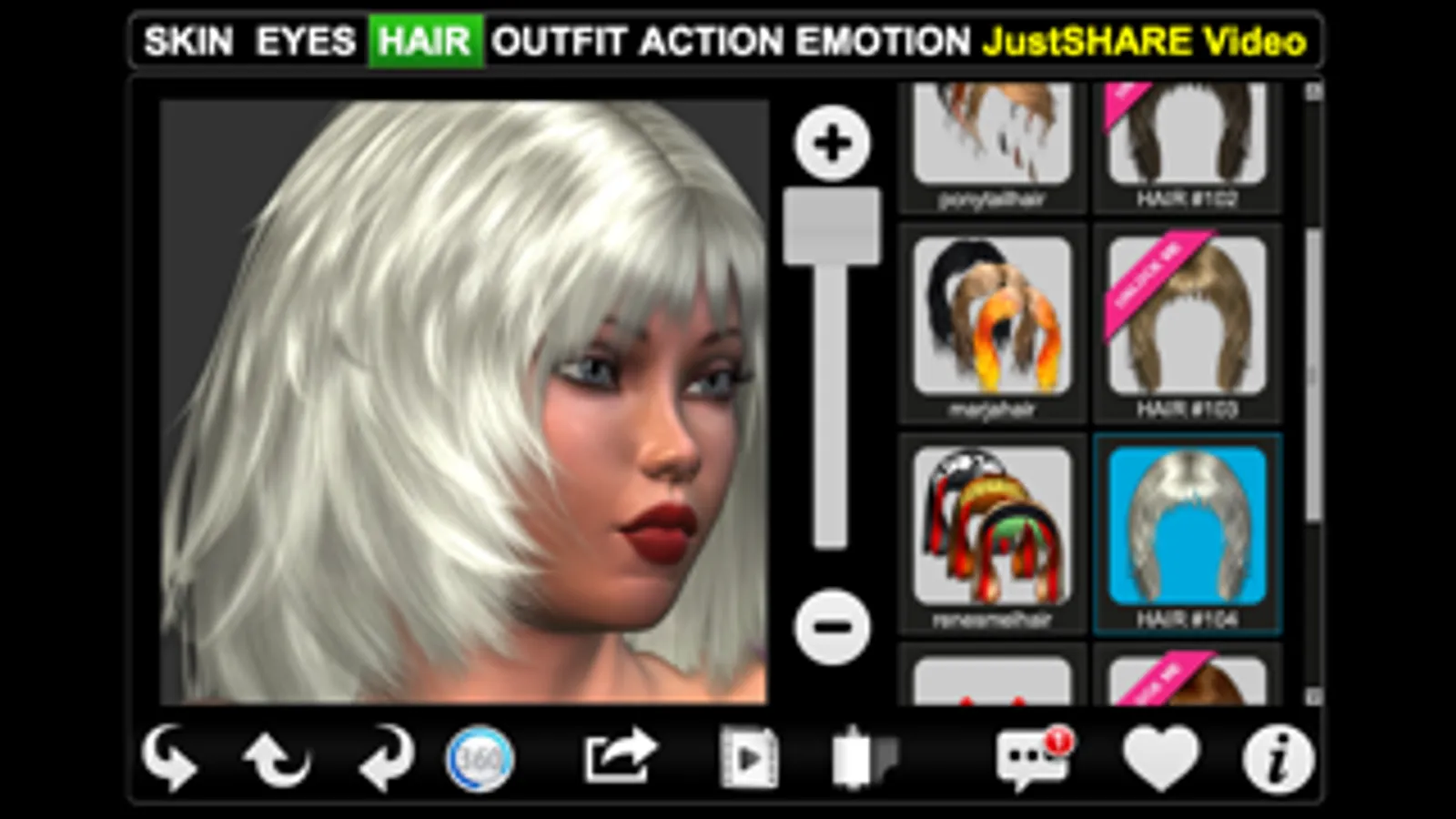 * She comes with one color unlocked for each hair style and outfit. Additional colors may be purchased through in-App purchase.