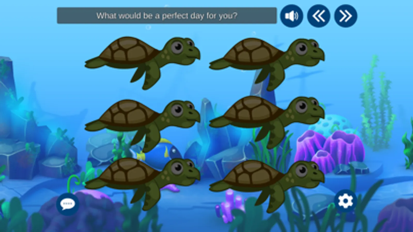 The child chooses a conversation topic and answers conversation questions using the Turtle Pacing Board. They have to press and hold down on a turtle and say one syllable or word per turtle.