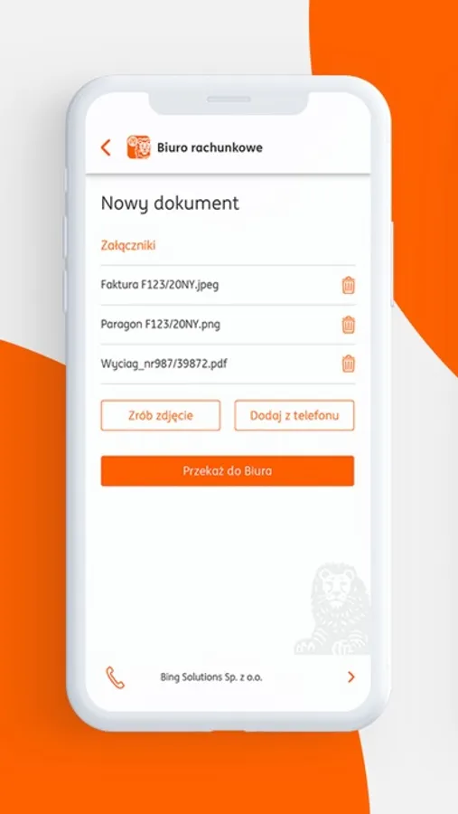 Klienci Biura rachunkowego ING mogą, używając aplikacji ING Office, przekazywać faktury sprzedaży, kosztowe oraz dokumenty kadrowe do aplikacji ING KsięgowośćOnline – prosto w ręce opiekuna księgowego i/lub kadrowego. Dzięki odpowiednim zabezpieczeniom (szyfrowane protokołem, certyfikowane połączenie między aplikacjami oraz logowanie dedykowanym kodem PIN) dane Twojej firmy będą zawsze bezpieczne.