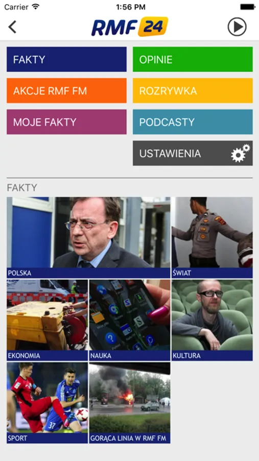 Artykuły w aplikacji zostały podzielone na kategorie: FAKTY, OPINIE, AKCJE RMF FM, ROZRYWKA. Można także skonfigurować własny zestaw tematów - MOJE FAKTY.