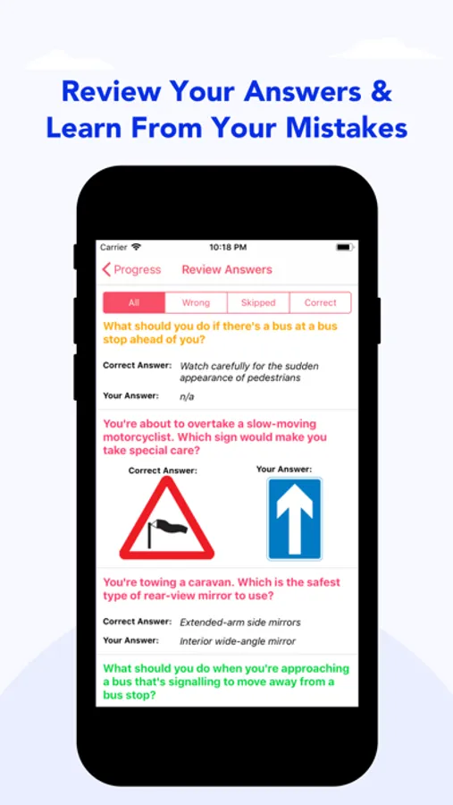 Each practice question contains the explanation of the answer from the DVSA, increasing the effectiveness of your driving theory test preparation.