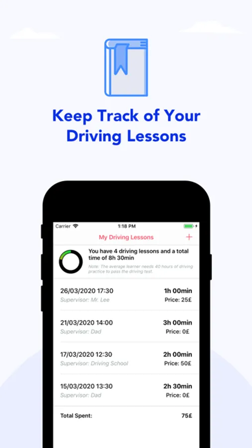 Keep a track of your driving lessons. Save your lessons, add times and dates, traffic conditions, notes and lesson costs.