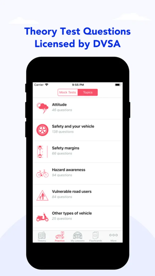 Test your knowledge and go through revision questions, answers and explanations, licensed by the DVSA (the people who set the official test).