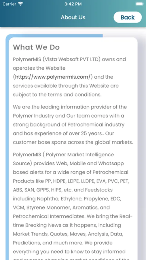 The PolymerMIS iOS application provides Real time information related to the Global Petrochemical Markets on your iPhone/ iPad. The application allows instant access to Daily Price alerts, News updates and reports on Products such as Crude oil, Naphtha, Olefins and Polyolefins.