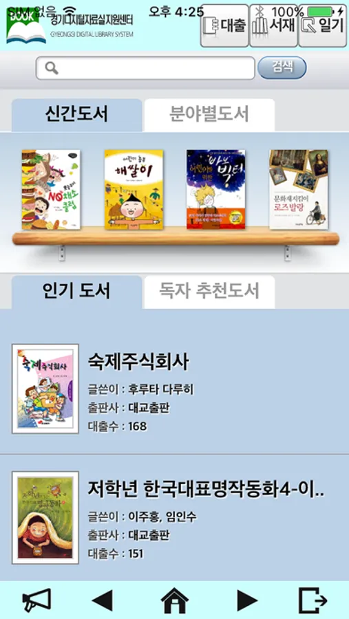 경기디지털자료실 지원센터 도서관의 도서이용 서비스를 스마트 폰에서 손쉽게 사용할 수 있도록 구성하였습니다. 도서의 검색에서 시작하여 도서 대출현황, 예약, 신청 등 도서관에서 이용할 수 있는 기능을 경기디지털자료실 지원센터 도서관 홈페이지를 접속하지 않더라도 스마트폰을 통하여 언제 어디서든지 이용할 수 있습니다