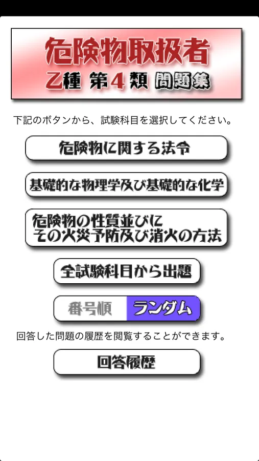 各科目を順番に解答するモードでじっくり学習・復習し、全科目からランダムに出題するモードで試験前の総復習が可能です。