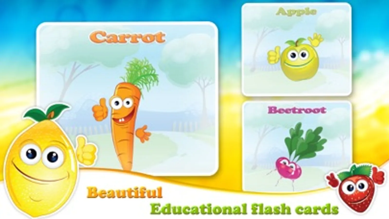 - Flash Cards will teach your kid Vegetables and Fruits names, written or heard, and to associate them to the plants and to their colors too.