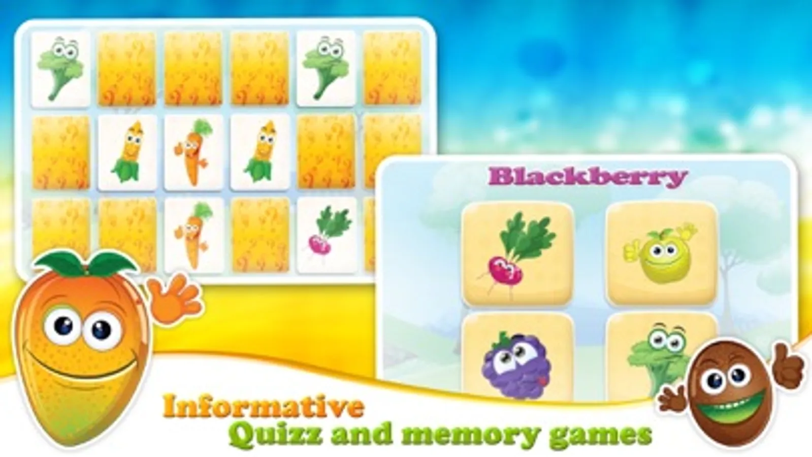 Including 5 different activities, this app covers all educative and entertainment needs of your child related to Vegetables and Fruits: