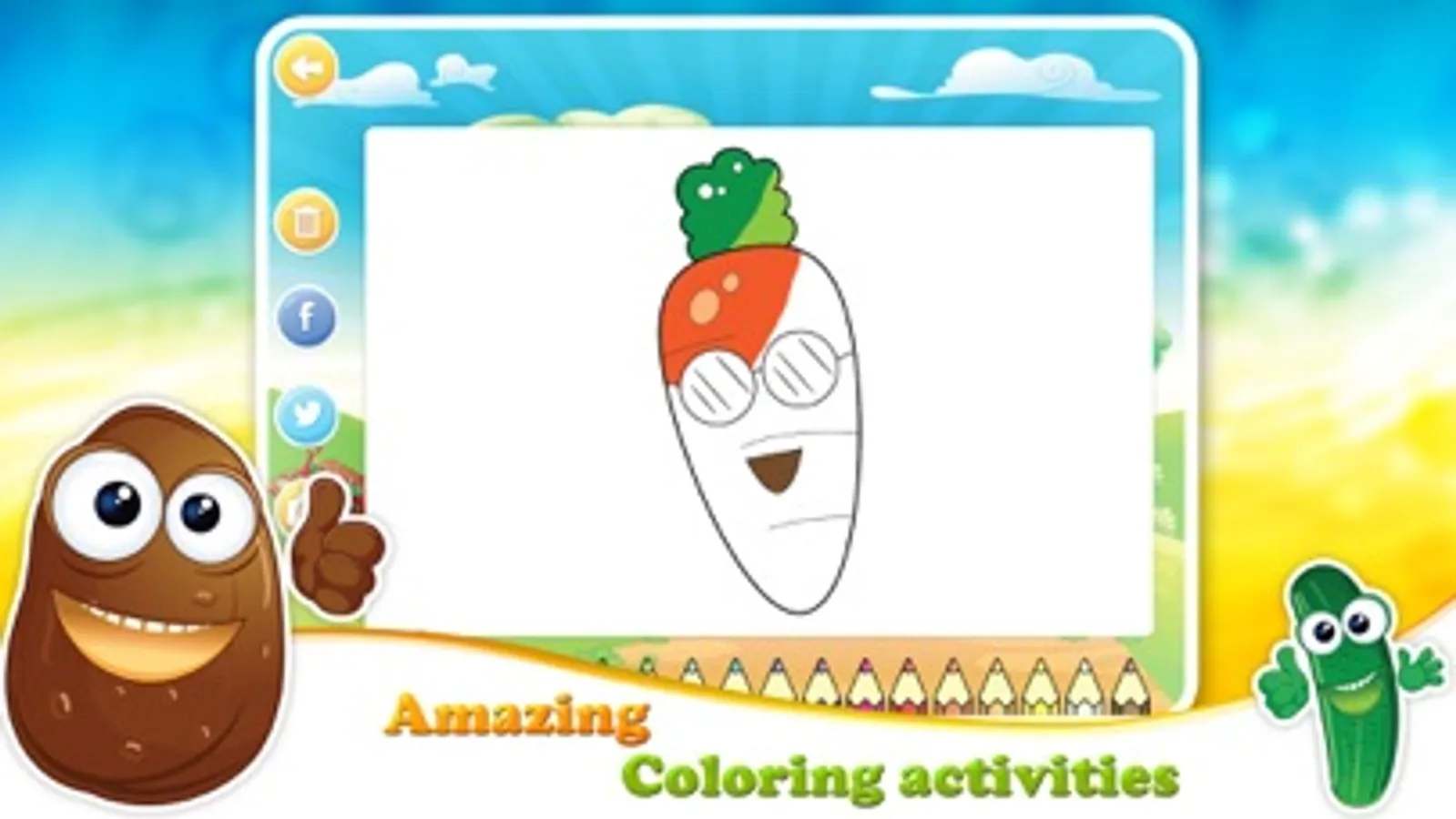- Does your child love coloring? In this app he can draw and color the Vegetables and Fruits coloring pages, then save them to the photo gallery, or share them to Facebook or twitter.