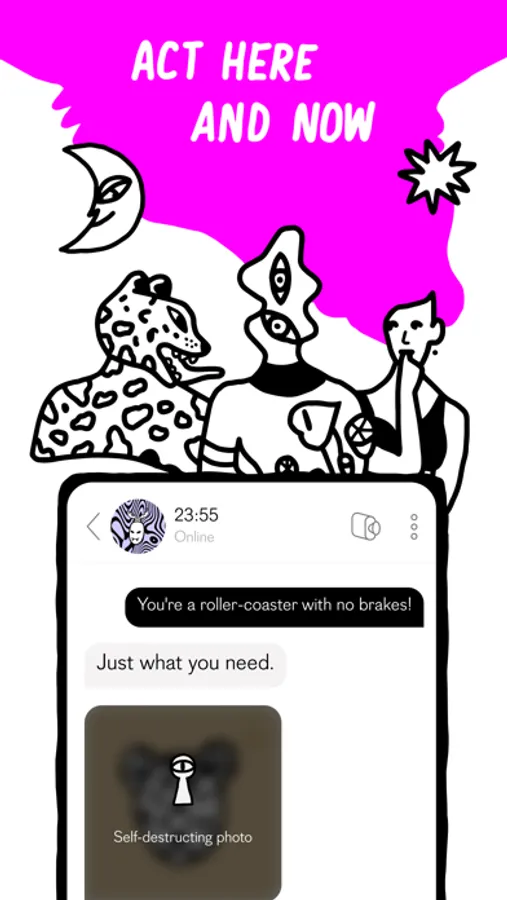 Photos self-destruct right after being seen, and in case someone takes a screenshot, you will get a notification about that. Also, all chat messages, including photos and audio, shared in chats cannot be saved to the phone's gallery.