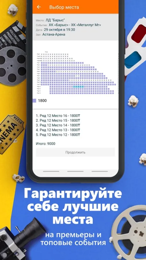 Здесь Вы можете приобрести билеты на любые интересующие Вас мероприятия, от кино до концертов, от бассейнов до мастер-классов. К нашей системе подключено более 40 кинотеатров, включая сеть кинотеатров Chaplin, Cinemax, 70 театров, включая кпупнейшие: Астана Опера, Астана Балет, ГАТОБ им.Абая, театр драмы им. Лермонтова, Спортивные клубы: ХК Барыс, ХК Сарыарка,ХК Торпедо, ФК Кайрат,ФК Астана,ФК Актобе и другие различные места проведения развлекательнвх мероприятий. Просто выберите места, оплатите удобным для Вас способом - и вперед за эмоциями!