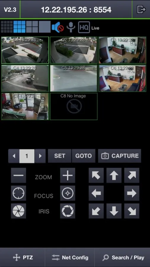 Instead of searching through setup menus to access the function you need, the On Cue Viewer app provides all of its functionality from one main screen. Simply swipe to view the matrix, tap and hold to bring-up PTZ controls or take snapshot. Tilt the screen vertical for Search/Playback and Connection Controls. It’s just that simple!