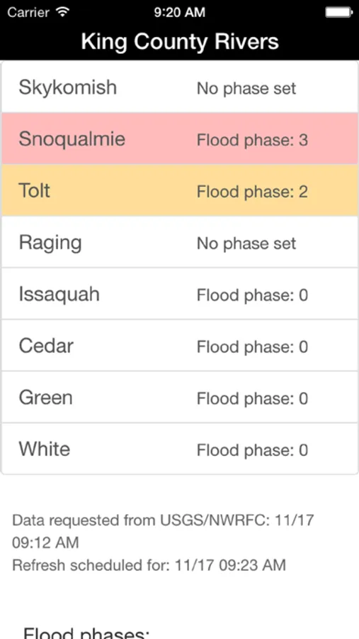 The King County Flood Warning app helps safeguard people and property by providing real-time flooding info for the Skykomish, Snoqualmie, Tolt, Raging, Cedar, Green and White rivers, and Issaquah Creek. If you live, work, go to school or regularly travel in or through these areas of King County download this app to track flood conditions. The app shows current river flows, flood stage data and forecasts plus real-time flood phases. Hydrographs make it easy to see several days of river data and forecasts. This app uses data from U.S. Geological Survey and National Weather Service and Northwest River Forecast Center downloaded every 10 minutes (source data update timing varies). Developed by King County and funded by the King County Flood Control District.