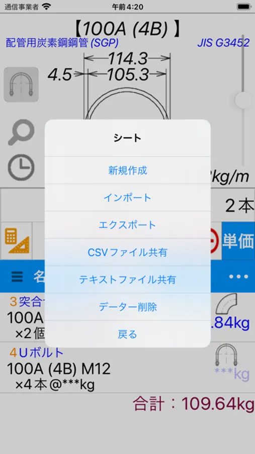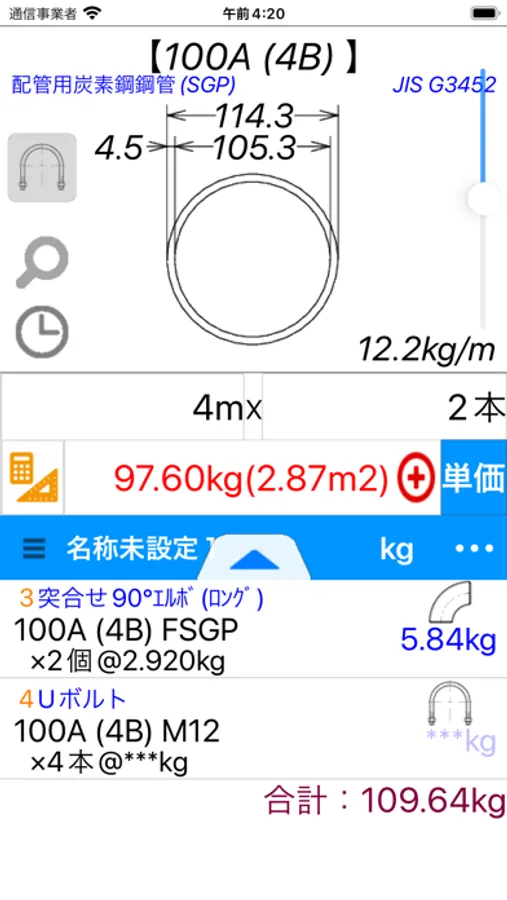 重量を計算しない配管材料の計算結果には”(***kg)”表示